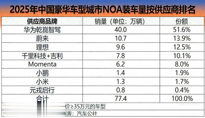 汽车媒体「汽车公社」统计显示,2025年35万元及以上豪华车搭载领航辅助的总销量达77.4万辆,华为乾崑智驾的搭载量达40万辆,市占率51.6%,超过半壁江山。这一成绩的取得,离不开其“产品体验有不同,用户生命无贵贱”的安全平权理念,让前沿安全科技惠及每一位豪华车用户。