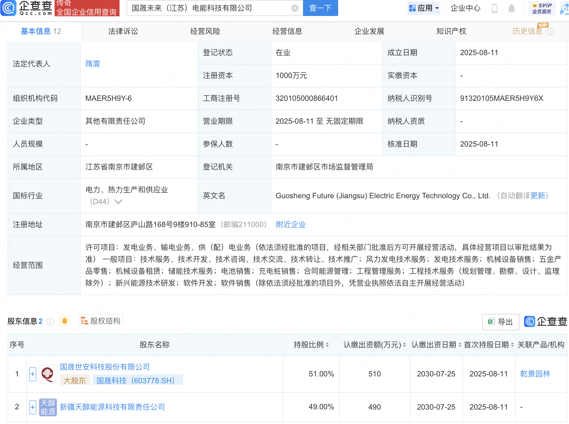 近日,国晟未来(江苏)电能科技有限公司成立,注册资本1000万元,经营范围包含:风力发电技术服务;发电技术服务;机械设备销售;五金产品零售等。企查查股权穿透显示,该公司由国晟科技(603778)等共同持股。